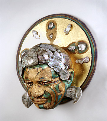 Plaster fabric, abalone shell, paint, hemp, gold leaf.