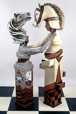 Plaster fabric, chamois, wasp nest, fur, wood, paint, brass, shells, paper, plexiglass, electric lights.