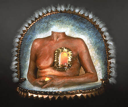 Plaster fabric, copper, brass, feathers, shell, electric light.